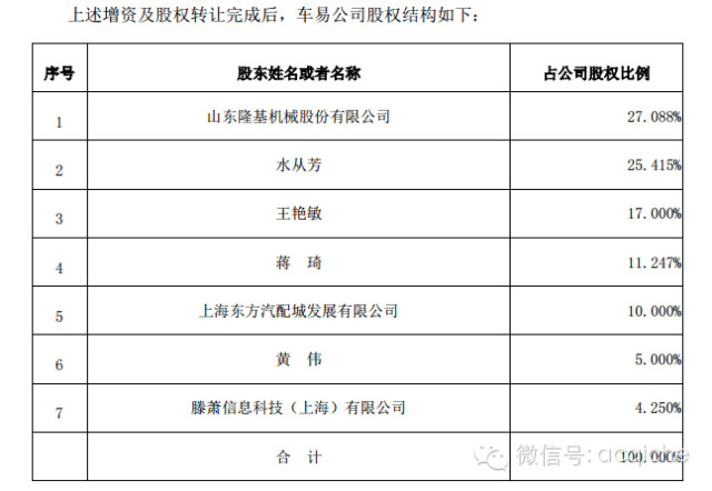 10月7日,隆基机械发布公告称,已与车易公司、车易公司股东水从芳、王艳敏、滕萧信息科技(上海)有限公司、上海东方汽配城发展有限公司、自然人蒋琦签署《总体合作协议》,以自有资金2592.69万元通过增资和受让股权的方式取得车易公司27.088%股权。增资完成后,隆基机械成为车易公司单一第一大股东。