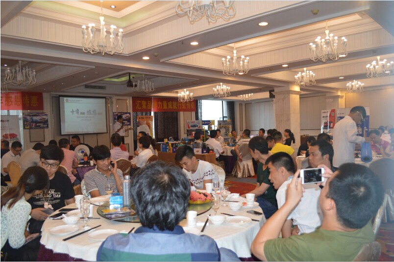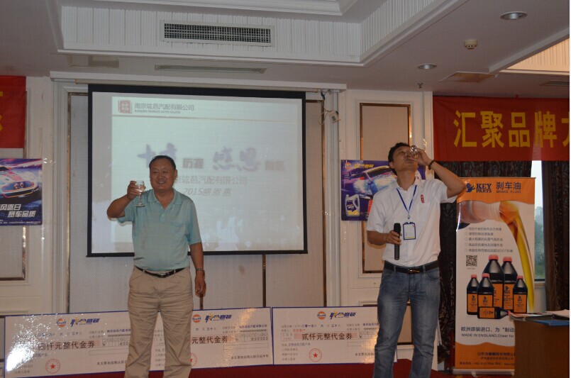 随后盛联滤清器销售总监刘刚、联合意顿海湾润滑油销售总监石文超、海拉江苏区域销售经理蒙大鹏、岱高皮带江苏区销售经理杨捷等人通过言简意赅描述了企业的成立背景、发展历程、品牌定位及南京竑邑本次答谢会议上的销售政策,让在场的修理厂不仅从门店管理、产品知识有了更加清晰的认识及学习,并且针对促销政策来袭,各个修理厂纷纷把握良机下单为本次答谢宴会上增添喜气及开心。宴会接近尾声,南京竑邑汽配有限公司范虹艺总经理向各位来宾的参会再次表示了感谢,并且许诺将秉承最好的产品,最好的价格,最优质的服务来与汽修厂协同发展,博得了全场热烈的掌声而拉下帷幕。