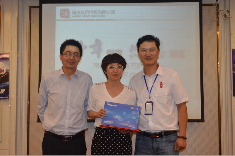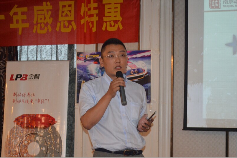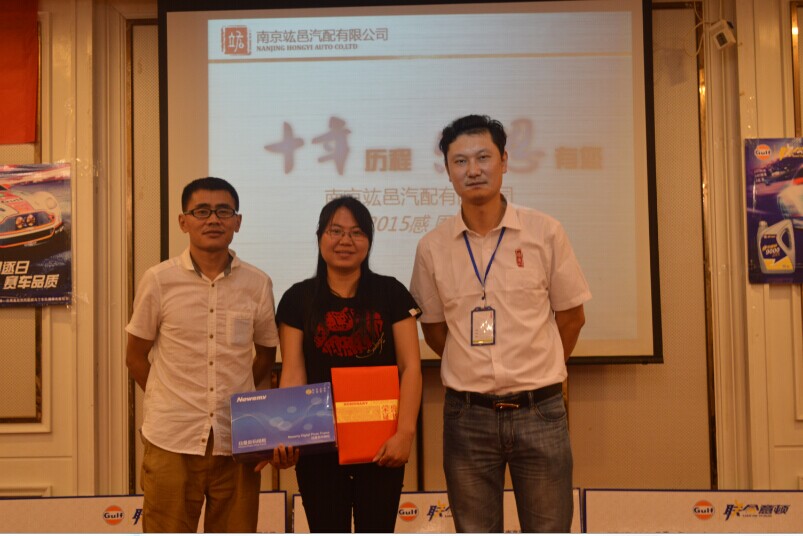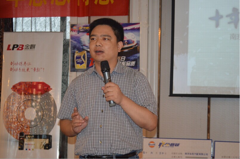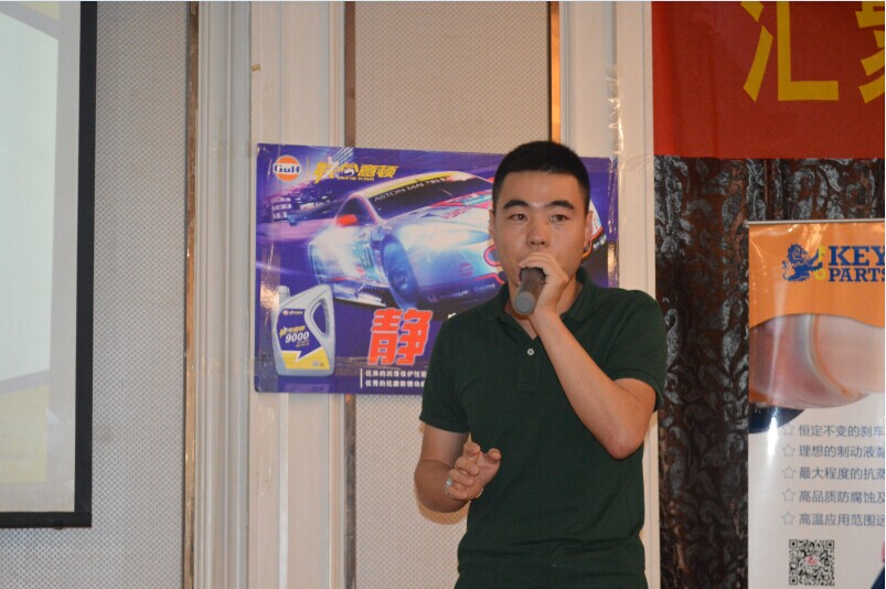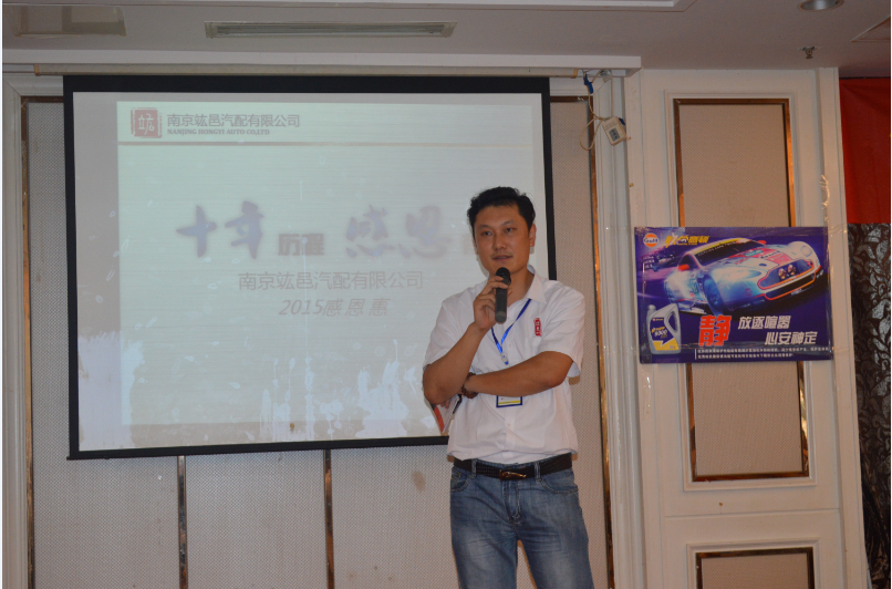 范虹艺走向讲台首先向所来参会的客户来宾深深鞠躬,对大家的到来表示热烈欢迎和由衷的感谢!南京竑邑汽配有限公司成立于2004年,是南京市较早的一家专业做品牌件的汽配贸易公司。从当初的父子店,努力拼搏发展到现在公司在整个江苏省有9个门店,南京有5家门店,分别在徐州、连云港、苏州、江阴、南京大明路宁南店、南京仙林店、南京桥北大厂店、南京河西店,共计60多员工。现有公司合作品牌有:金麒麟刹车片、嘉时安刹车盘、汉格斯特滤清器、岱高皮带、盛联滤清器、联合意顿海湾机油、盖资皮带、海拉车灯、冠盛球笼、泰明顿刹车片、FKG轴承、火炬火花塞等产品,主要服务于专业修理厂、汽车4S,提供易损件贸易服务。致力于为产品专业知识咨询、营销于一体的专业服务商。公司以“专注汽配,用心服务”为中心价值,通过公司全体员工的专业程度和不懈努力 ,为企业产品推行,以及所服务的客户的发展做应有的努力。