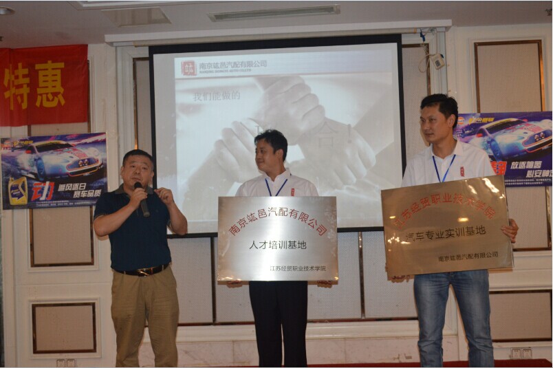 融合发展不单单只停留在供应商层面,更要做好资源的整合,如人才、技术、物流及金融的整合。多年来,南京竑邑汽配有限公司不断秉承以用户需求为中心,不仅为客户提供优质产品,及时的发货,间断性的优惠政策,同时在听取修理厂发展境遇中,了解到修理厂在人员招聘、人员培训方面是一大难题,在企业经营管理上也需要提升。这些问题对于南京竑邑汽配的员工来讲是听在心里,付于行动。在6月初,南京竑邑汽配有限公司总经理范虹艺就前往江苏经贸技术学院与就业办的老师探讨就业及实践课程如何与理论知识相结合,整个汽车后市场配件经销、修理厂大量专业维修工的缺乏,并且这个产业前景非常好,实行校企合作,联合办学,学生实践基地,课程开发深层次的合作。在100位修理厂的见证下,南京竑邑汽配有限公司与江苏经贸技术学院合作匾牌的互赠仪式现场进行。