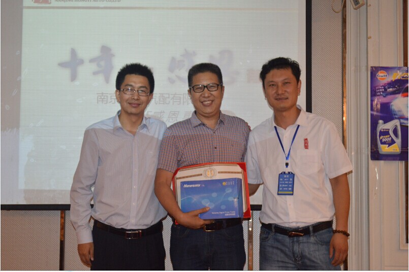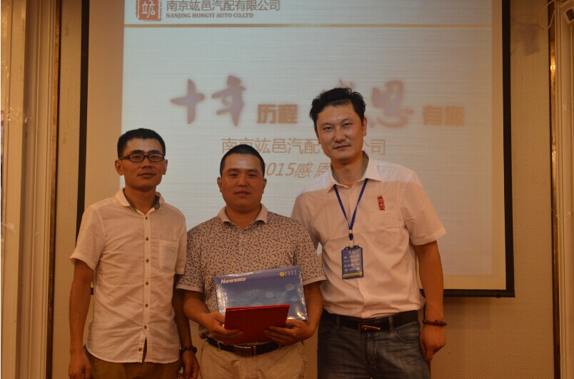 筑有金巢在,也得引来凤。企业的发展离不开相伴相随的客户,南京竑邑在创立之始就得到一批客户持续的支持,才有不断发展的动力,总经理范虹艺在在表达此情之时略带哽咽,会上向南京颂诚汽修厂、南京润城汽修厂、南京奇峰汽修厂、南京戎顺汽修厂为代表的汽修厂呈上了感谢荣誉证书,颁发证书的嘉宾分别为金麒麟售后市场部长宋常宝、盛联滤清器销售总监刘刚。全场响起了持久的掌声和祝贺声。