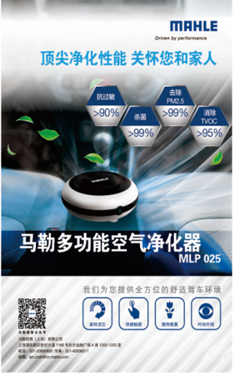 上海,2016年1月29日- 面对日益严重的空气污染,越来越多的人开始关注车内空气质量问题。作为滤清器领域的专家,马勒推出了首款多功能空气净化器MLP 025。这款净化器凭借其时尚精致的外观与顶尖的净化性能,在2015年法兰克福展会上一经亮相即备受各界人士瞩目。