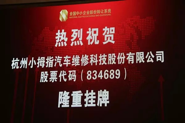 2015年12月9日小拇指834689.OC在新三板挂牌上市。杭州小拇指汽车维修科技股份有限公司上市主办券商为中金公司,会计师事务所为天健会计师事务所,律师事务所为浙江六和律师事务所。