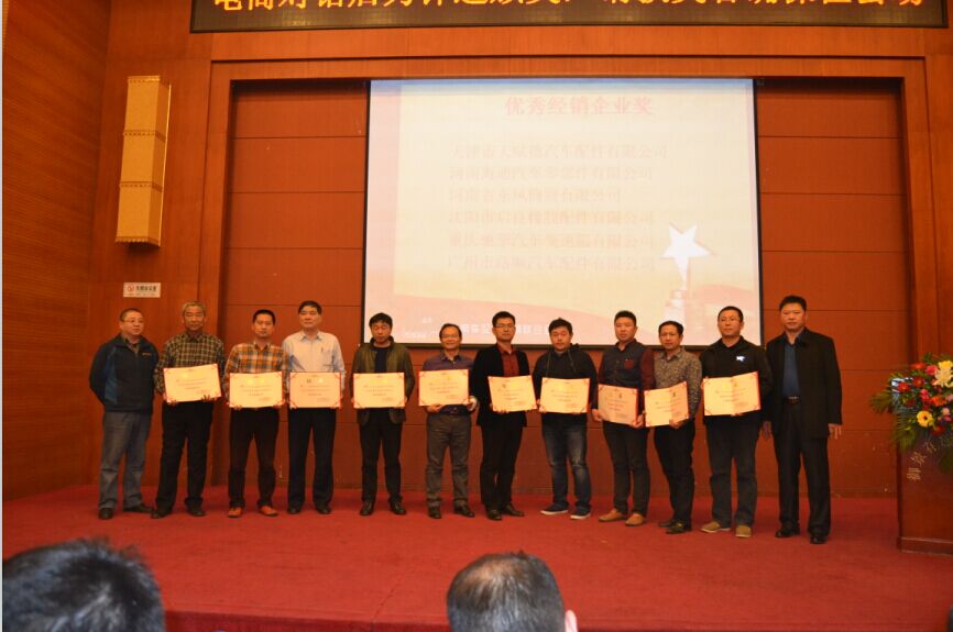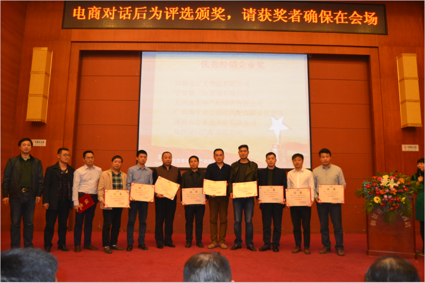 39个优秀经销企业奖:滦县兴达商贸有限公司、安徽大成实业有限公司、江西蓝鲸汽配有限公司、北京天元联发汽车贸易有限责任公司、北京京齿桥工贸有限公司、成都市紫东汽车配件有限公司 、临沂市南跃汽配销售有限公司、重庆恒冠商贸有限责任公司、山东九鼎控股集团、宁夏大地乐驰商务有限公司、青岛日新瑞祥商贸有限公司、运通四方汽配供应链股份有限公司 、江苏正大富通股份有限公司 、兰州盛亚工贸有限公司、杭州百城汽车配件有限公司、杭州一汽备品零部件有限公司、乌鲁木齐杭汽发工贸有限公司、广州市穗丰万里汽车配件有限公司、合肥国海汽车贸易有限公司、济南德达汽车配件有限公司、济南同心汽配商贸有限公司、昆明鼎裕经贸有限公司、天津市天赋德汽车配件有限公司、云南闽万鑫经贸有限公司、河南海通汽车零部件有限公司、河南省东风商贸有限公司、沈阳市启良橡胶配件有限公司、重庆驰掣汽车桥箱有限公司、广州市路顺汽车配件有限公司、邯郸市正光物流有限公司、昆明碧海汽车技术服务有限公司、宁夏新三江贸易有限公司、太原市锦绣江山商贸有限公司、郑州鑫德隆汽配销售有限公司、广西南宁众合通达汽配有限责任公司、深圳市吉亚通实业有限公司、郑州冠同汽车配件有限公司、江西鑫益汽车配件有限公司、长春市盛世鸿瑞汽车配件有限公司