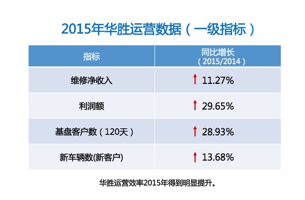 维修净收入统计的是直营店,增加不多只有11.27%,利润增长30%,基盘客户数120天增加了接近29%,新客户增长13.68%,这个数据不算好。但是有一点我跟大家分享就是,我们整个运营效率得到大幅度提升。