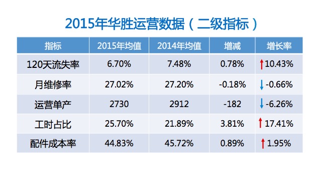 下面跟大家汇报我们的二级指标,流失率也从原来7.48%下降到6.7%,月维修率目前是基本持平,略微有所下降。我们单产一些费用剔除掉了,2015年2730,2014年2912,下降速度相对低一些。工时占比,2014年是不到22%,2015年平均25.7%,2015年最后一个月是27.1%持续在增长。配件成本率从原来45.72%下降到44.83%。以上是整个二级指标。
