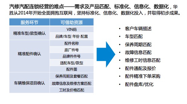 第三、全面拥抱互联网、坚持标准化、信息化、数据化投入。大家都知道互联网是一个趋势,为什么目前互联网没办法落地,因为车型太多,没有人解决这个问题,我们华胜自己干,我们已经把奔宝奥全部做完,你这个车要做什么保养,要做什么配件项目,价格可以全部出来,所以我们是真正实现了,在京东、天猫很多产品套餐可以在门店直接出现。