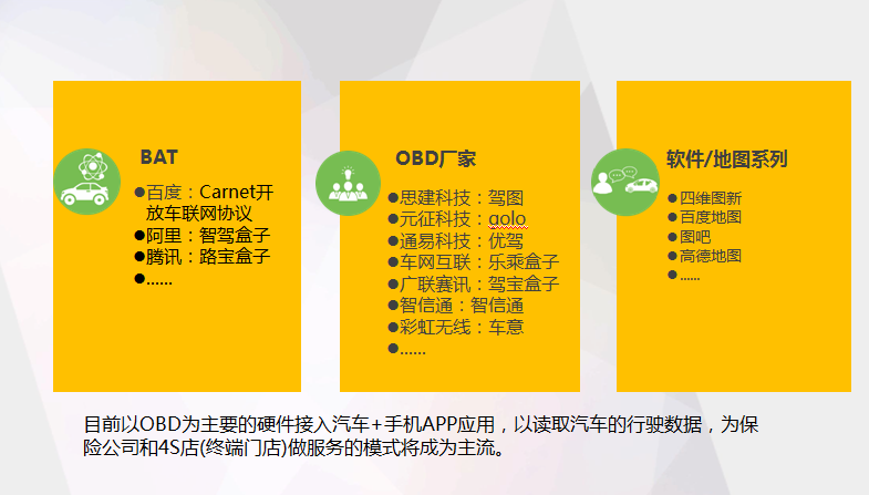 资讯、电商、社交是互联网三大巨头。资讯,当你的车上网以后,什么时候该保养、该维修,路段的实时数据是什么?今天很多城市,谈合作智慧城市都在谈智慧城市数据,但都缺乏一个数据来源,就是最准确实时完整的路况信息。电商,车服务车主生活,我们虽然在讲汽车服务世界,但是汽车服务,比如买保险,我们不希望车主三天两头去门店,所以我们和有些保险公司合作。保险公司希望提供给用户除了一次买保险的交互之外,中间10个月时间能跟用户多一点交互。如果我们用了车联网,判断车主开车比较少,开车平稳的,保险公司判断他经常在哪些商圈出现,送给他一些电影票,车主生活跟我们汽车服务市场就结合起来了,就是有温度的保险公司。