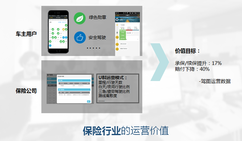 通过投入车联网的盒子,保险行业通过各种方式运营,承保/续保提升17%,赔付下降。最后结果是建立生态圈,每个大数据可以服务车的服务,可以服务我们的社交,可以服务我们车主的生活,这样的车联网才是真正为我们车主服务的。