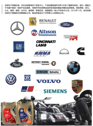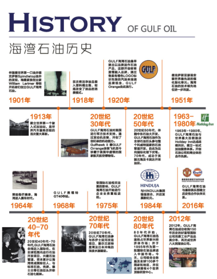 世界润滑油行业巨头Gulf海湾石油成立于1901年,历经115年的发展,成为世界上历史最悠久、最具影响力的跨国石油公司之一。如今,Gulf海湾石油以英国伦敦为全球战略中心,分公司早已遍布全球100多个国家和地区,其业务涉及石油行业各个领域,从乘用车、摩托车、商业运输、建筑、采矿钢铁、农业到工业制造和海运,Gulf海湾石油广泛地为这些应用领域提供优质的润滑油、养护品及配套服务。其母公司亨度嘉集团是全球知名的跨国财团,业务领域涉及汽车制造、能源、医疗保健、金融以及IT行业,在全球拥有超过65000名员工。