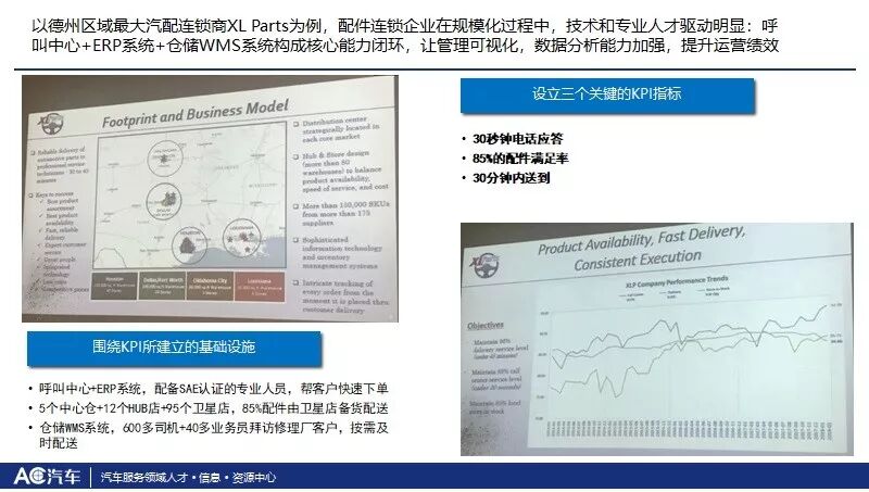 我们在美国参考了一家得克萨斯州最大的配件商XL Parts,他们给维修厂提供很多服务,包括维修厂的授信、解决库存问题、定期拜访修理厂、沟通需求、规划增值服务、积分奖励、提供培训、维修技术资料库等。他们设立了三个关键指标。