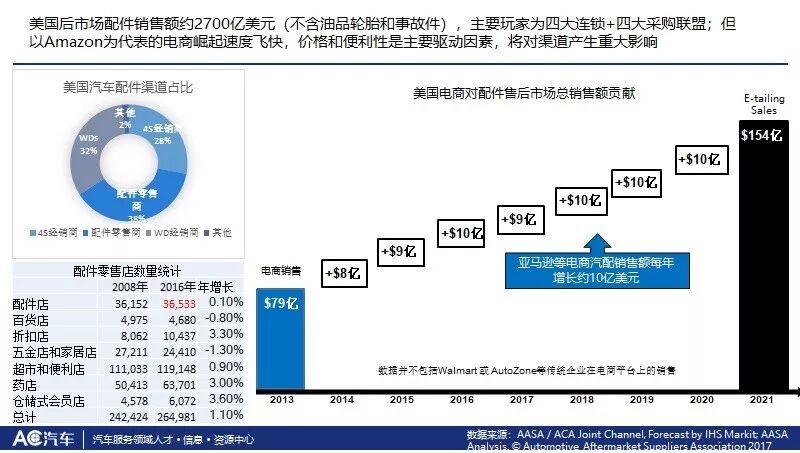 第一个区别:美国汽车后市场规模2700亿,但这2700亿的规模只是替换件的规模,不包含油品、轮胎、事故件,中国现在没有一个统计口径把所有的零部件包含在里面。