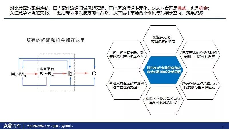 美国汽配供应链在高度成熟的情况下加速整合,国内汽配领域在短时间内发展会更快,模式、玩家也更多,这叫渠道多元化。外部环境正在发生巨大变化,所以企业要重新定位,找到产品、市场、需要补充的资源,然后聚集重点资源重新进入市场。