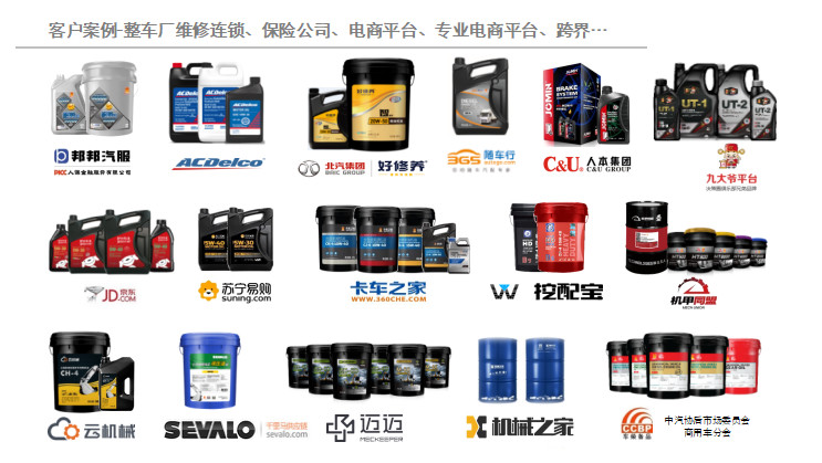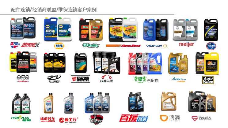 最左边的是美国最大的卡车联盟保险公司,第二个是美国最大的农机供应链公司。中间的三个是美国最大的超市,最右边的是美国最大的电商亚马逊。所有美国主流的品牌都在做自主油液品牌,做自主油液品牌已经成为了美国渠道的标配。