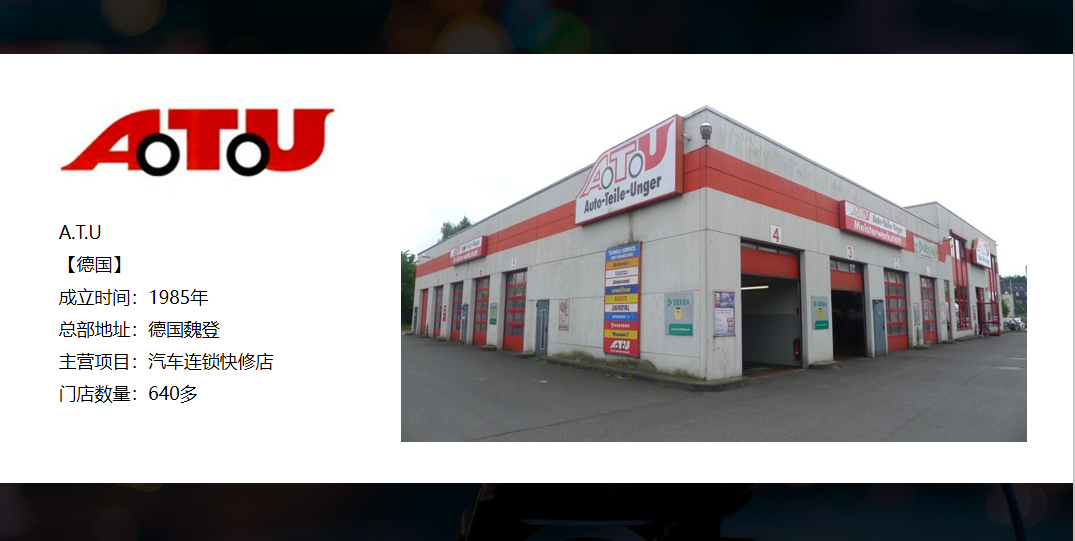 第一个,德国的ATU,这是德国最大的一家汽车配件销售和服务的连锁企业,这家企业在德国大概有640家门店。ATU的门店设置是前店后场。那么什么是前店后厂,简单理解就是前面有个卖场,后面是维修车间。这个业态中国很多人看不到,因为中国有汽配城。汽配城经济目前在欧洲、美国、日本等国家将会逐渐的消失,而中国的汽配城也将会转型。我们不能说中国的汽配城会消失,因为车主的服务将依托于社区化来做调整,这是毫无疑问的。社区化决定了车辆服务和门店服务的属性,所以这些门店都是社区门店。这些门店大多是社区门店,它们既是一个小型的汽配城,也是一个小型维修厂。