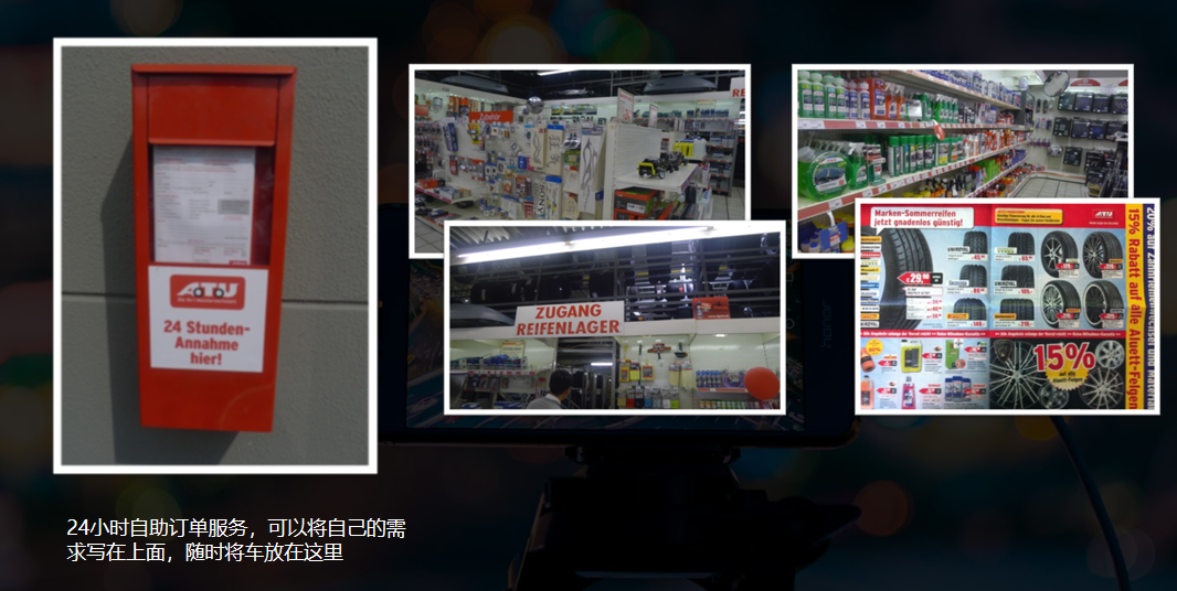 和中国不同,德国人特别严谨,早晨7点上班,晚上7点下班,即使是晚上的7:01分打电话,他也会回复不好意思请留言,你有再大的业务也不能联系我。中国则不同,即使是半夜也需要将客户服务做好。那么在欧洲,在门店的服务时间之外,客户可将自己的需求写在上面,随时将车子放在这里,门店就会做出相应的服务。