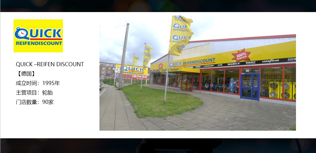 接下来要和大家分享的这家门店是QUICK –REIFEN DISCOUNT,翻译过来是轮胎快速打折店。门店的名字起得非常直白,但是在欧洲人心目当中这家门店的形象非常好,它的轮胎销售量非常大。在整个门店里面,你能看到的和相关的事情,跟这件事情相关形象的突出,代表的是一家门店的专业度,无论它的前台、展厅、车辆,所以你靠什么来让车主看到你的门店的专业度,形象这件事情很重要。专业度就代表了你能不能够收它的服务费,代表了他愿不愿意花更多的钱在你这里来做服务,这件事情值得我们思考和学习。