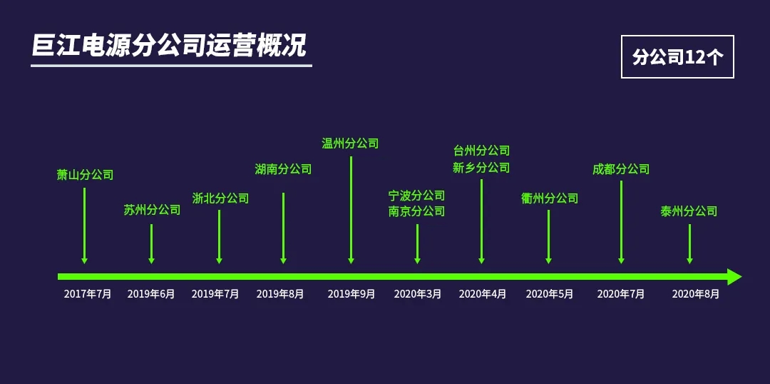 继浙江分公司(5家)、江苏分公司(3家)、湖南分公司、河南分公司等分公司运营后,巨江电源-成都分公司也于2020年7月,正式开启了运营阶段,这标志着巨江公司区域化布局战略的深入推进。