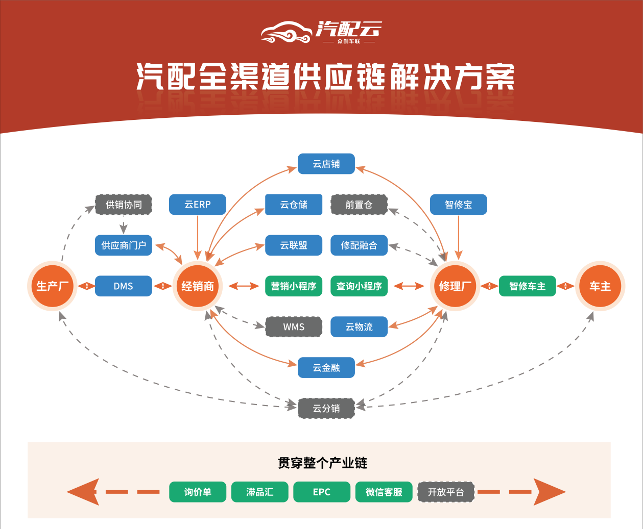 汽配云成立于2014年,致力于通过移动互联技术和大数据来变革传统汽车后市场,为车后市场产业链转型升级赋能,助力车后市场产业链朝“数字化、在线化、标准化、智能化”发展,解决各大厂商行业竞争激烈、市场渠道等问题。