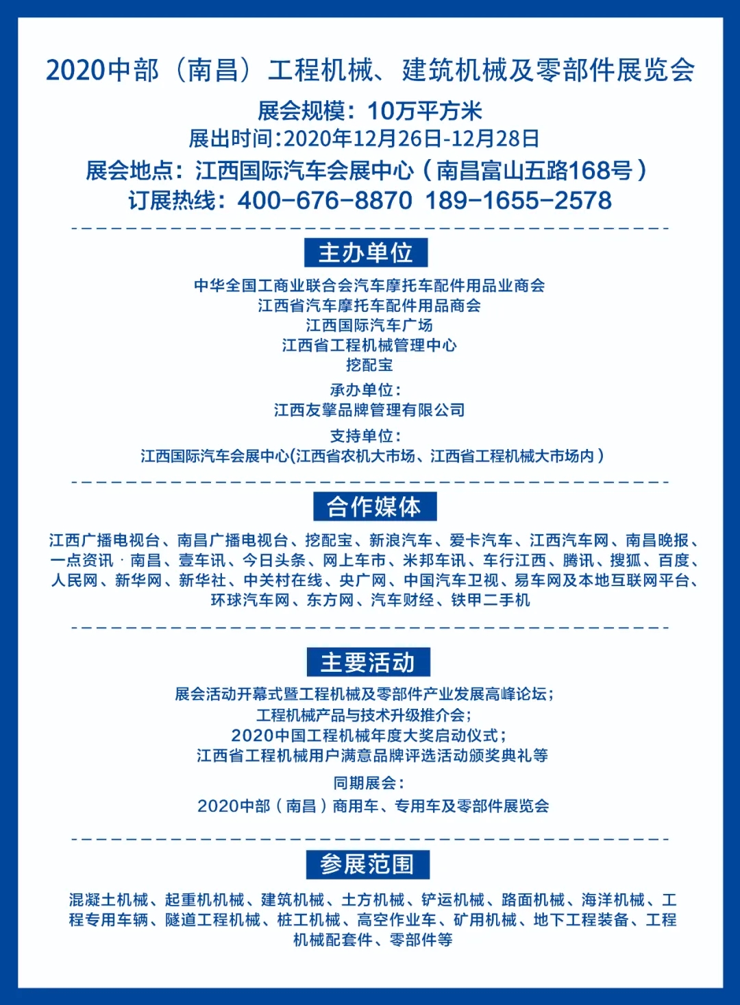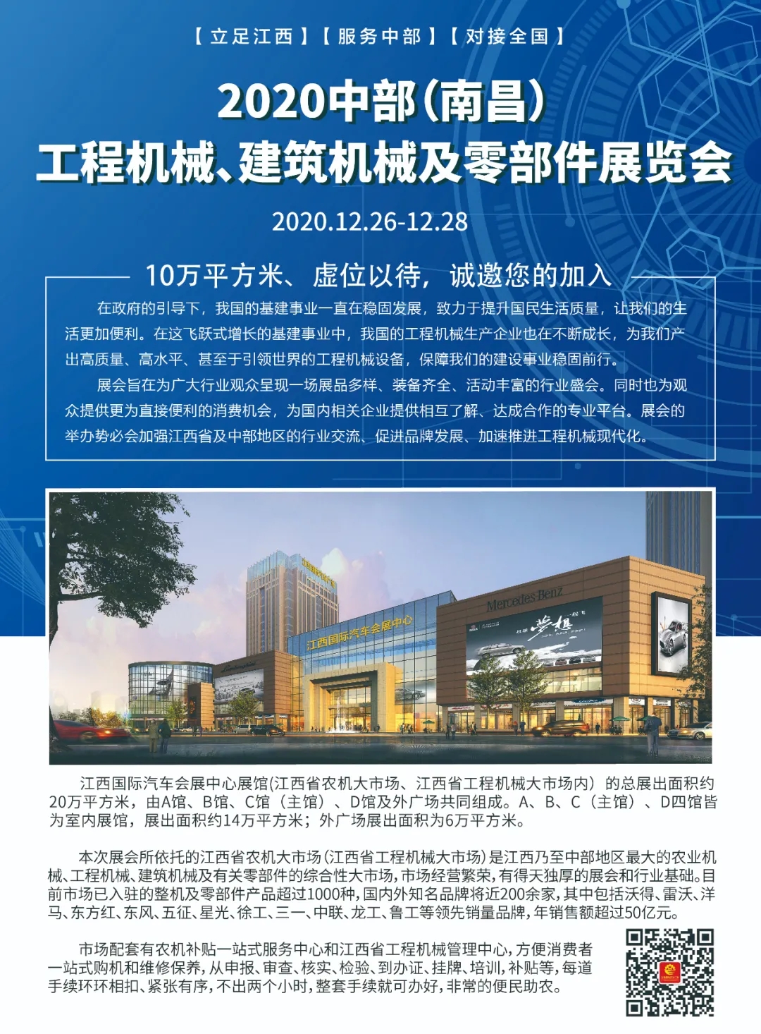 2020年12月份在江西国际汽车会展中心举办“2020中部(南昌)工程机械(建筑机械)及零部件展览会”,将成为整个江西乃至中部工程机械(建筑机械)市场上规模、参展品牌、影响力均较大的行业盛会。依托成熟的江西国际汽车广场工程机械大市场项目,展会旨在为广大行业观众呈现一场展品多样、装备齐全、活动丰富的行业盛会。展会接轨江西南昌重点打造的千亿建筑产业园、园林、高速、城投、隧道、建筑公司、机械设备租赁公司等资源进行采购对接,同时也为观众提供更为直接便利的消费机会,为国内相关企业提供相互了解、达成合作的专业平台。展会的举办势必会加强江西省及中部地区的行业交流、促进品牌发展、加速推进工程机械现代化。