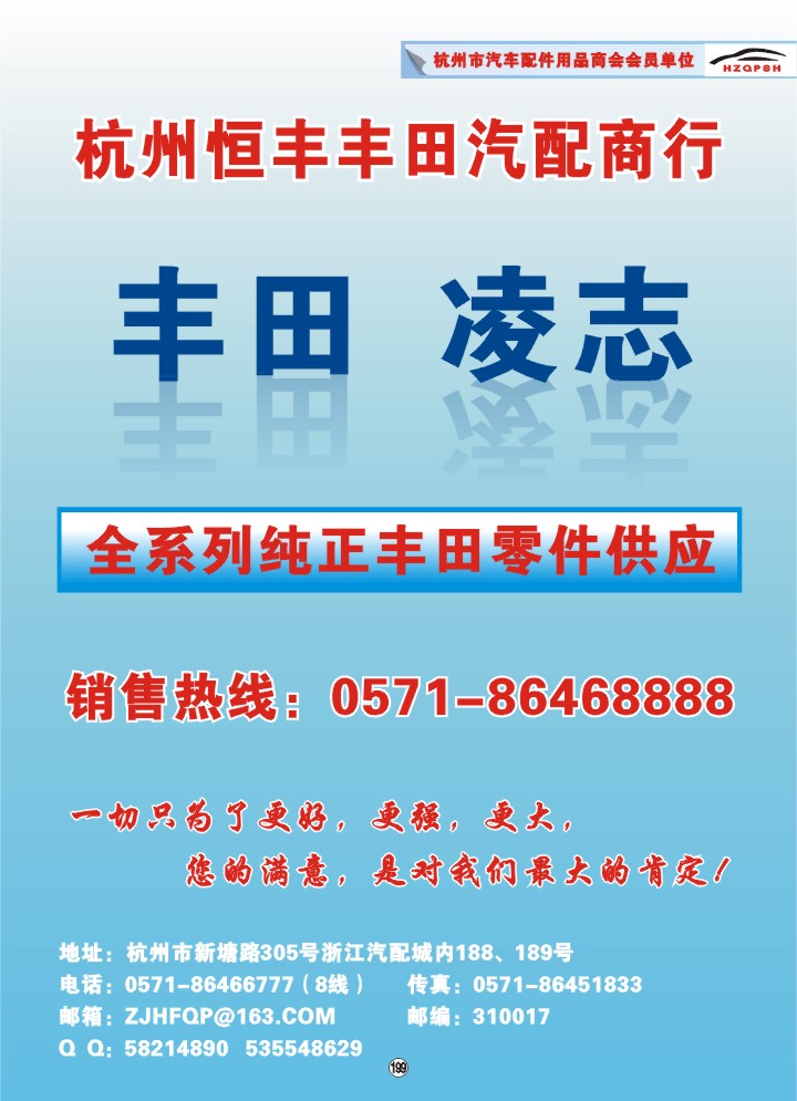 杭州恒丰汽配成立于2004年7月15日几年来一直经营丰田纯正零件,目前我公司库存达一万五千多项,年销售收入几千万。公司拥有现代化的营业厅、完善的配件供货管理系统、专业的营销团队以及广泛的网络销售。长期以来我们以纯正优质的产品、合理的价格、完善的管理、真诚热情的态度服务客户。五年中,我公司创造了汽配行业一个奇迹!经过这几年的成长和提炼升华,在国内同行业、同车型中具有相当的影响力! 2009年,公司投入几百万元资金新建和完善公司的硬件设施,以期在未来的三五年中做到行业内同车型中的第一位。在公司快速发展的同时,我们更注重人才建设、员工培养,提供员工一个展示自己、完善自己、实现自己人生价值的平台。公司秉承“顾客至上,锐意进取”的经营理念,坚持“客户第一”的原则为广大客户提供优质的服务。我们将坚定不移地遵循“守约、保质、薄利”的经营原则,与广大客户携手合作,共创宏伟蓝图! 公司主营:国产丰田系列:CROWN皇冠,REIZ锐志,CAMRY凯美瑞,COROLLA花冠,VIOS威池,汉兰达,雅力士,LAND CRUISER陆地巡洋舰,PRADO普拉多,COASTER柯斯达,; 进口丰田系列:CAMRY佳美,LEXUS雷克萨斯,PREVIA大霸王,RAV4,HIACE海狮面包。 公司也为广大客户提供全方位的服务,涉及:零件业务的咨询和销售,空运急件,海运期货专订,市内配送业务和市外省外代办运输业务。公司业务部电话: