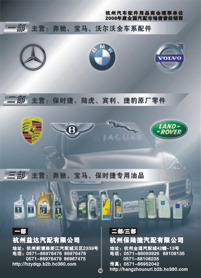杭州益达汽配行专营:奔驰.宝马.沃尔沃.宝时捷等配件益达汽配行成立于2002年是一家经营多年汽配行。拥有奔驰.宝马.沃尔沃.宝时捷配件的电子EPC查询系统。还有本行有强大仓储备件.  我们的服务宗旨:“价格公道.时间迅捷.保证质量.”本行所有配件均为原厂配件.欢迎新老客户来电来函.....