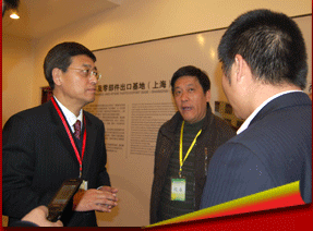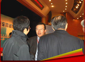 中国汽车零部件工业公司总裁陈康仁(左二)与参会企业交流