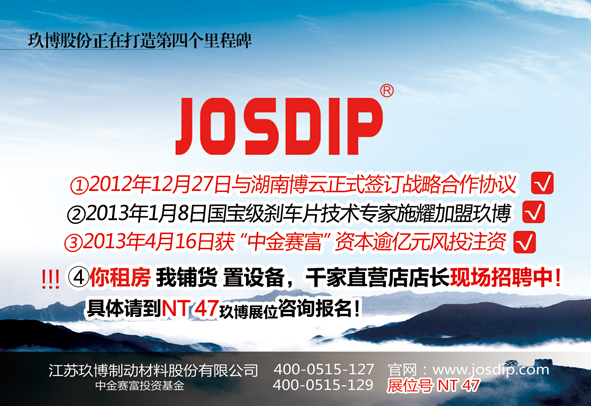“玖博股份”与“博云股份”决定强强联合,确定战略合作关系,旨在做到最强势的资源互补,共同致力建立密切的生产营销体系,约定双方的权利和义务,共同打造世界一流的刹车片企业“JOSDIP研发—生产—销售—售后平台”,从而努力使战略合作伙伴总产能迅速释放,尽快将“玖博”在刹车片钛基新材料方面的研究成果迅速转变成生产力,打造国民放心的刹车片,使我国刹车片生产水平领先于欧洲,崛起于世界!测算后拟定2017年战略联盟销售目标的为150亿人民币。