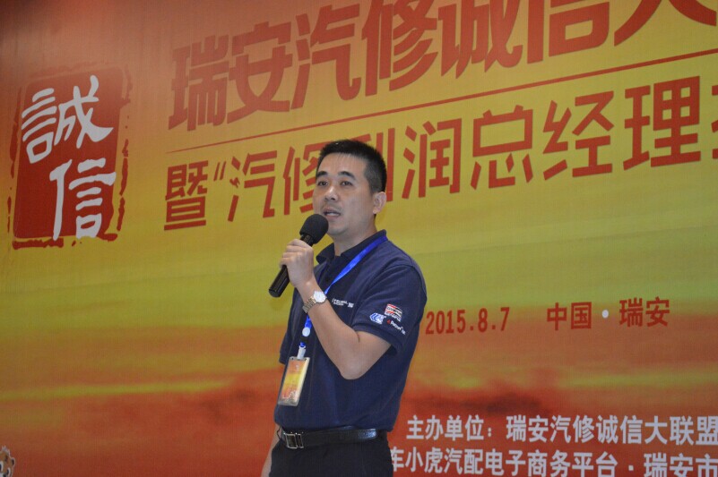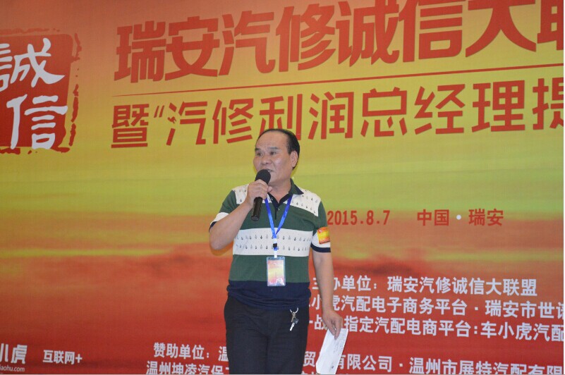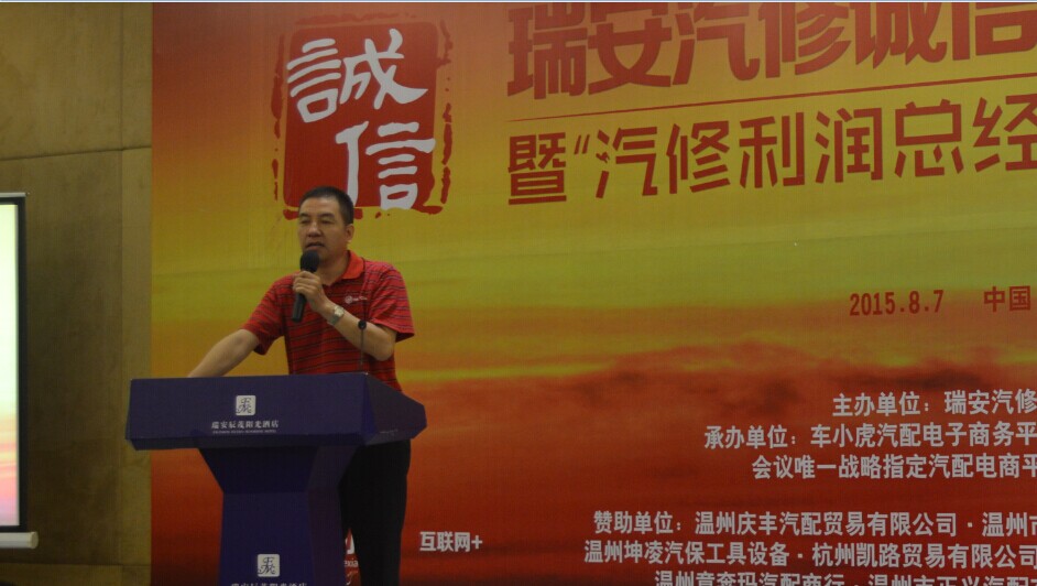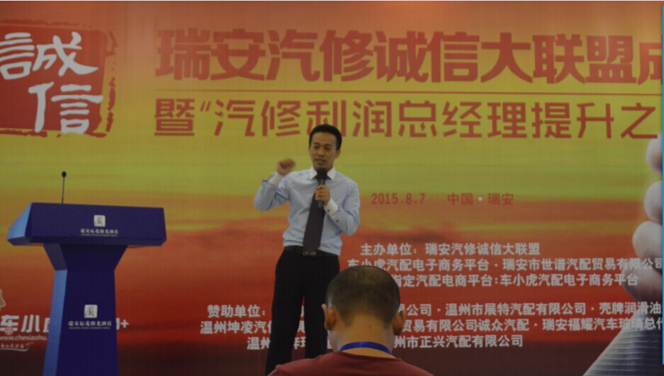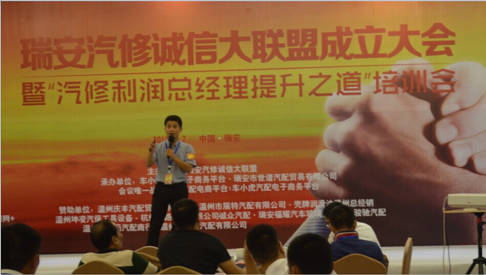 8月7日,一场围绕"诚信、共享、创新、集成"为主题的瑞安汽修诚信大联盟成立大会暨汽修利润、总经理提升之道培训会在瑞安辰茂阳光酒店举办.本次会议由瑞安汽修诚信大联盟主办,车小虎电子商务平台和瑞安世谱汽配联合承办.来自瑞安市180余位修理厂企业负责人;以及包括辉门、回天胶业、意奔玛、Hicar等供应商代表;同时20余家瑞安汽配经销商共计200余人参加了此会.大会还特意邀请了瑞安市道路运输管理局和瑞安市汽车维修协会的相关领导到会并且发表讲话,其中大会邀请来自上海国际汽车零部件采购中心资深顾问张治、宝达之星CEO汪宣强、《聚汽观察》杂志主编付小军、车小虎CEO黄文俊四位演讲.大会由《聚汽观察》杂志主编付小军主持,会议9:30开始.
