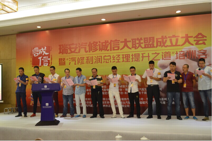 在两家主管单位领导的管辖指导下和见证下,由瑞安利宾行汽修、瑞安宝诚汽修、瑞安晨通汽修、瑞安名驰汽修、瑞安瑞龙汽修等12家汽修厂发起的诚信联盟走向舞台一一向参会来宾们分享这些年来经营的困惑和对成立联盟的积极呼吁,并且带动场下的众多修理厂共同宣读诚信承诺书,并且一致认定联盟能促进修理厂之间的友谊和团结、增加联盟成员的利润、共享和互享技术、人力资源、统一采购降低成本提高利润,大家一致决议要把这个诚信联盟组织办成办好.