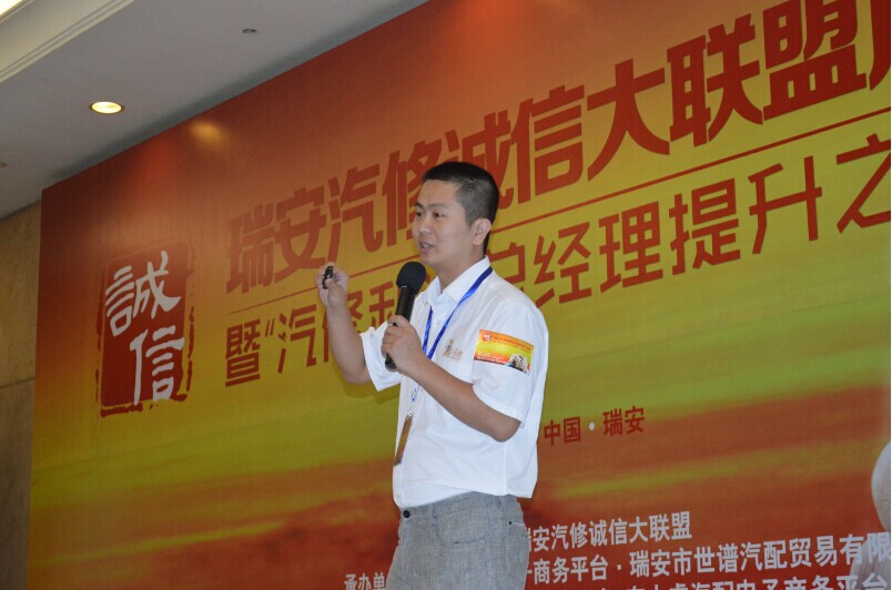 瑞安汽车维修协会会长项功程先生的致辞中首先非常肯定瑞安汽修诚信联盟成员的行动力及配合力,在如此短的时间内能办成这个有规模的会议,并且今天邀请了许多专家来我们瑞安汽修企业们带来精彩的演讲,真的很棒.希望汽修诚信联盟以此为良好的开始,并且要将企业之间的公约,配合力坚持好.