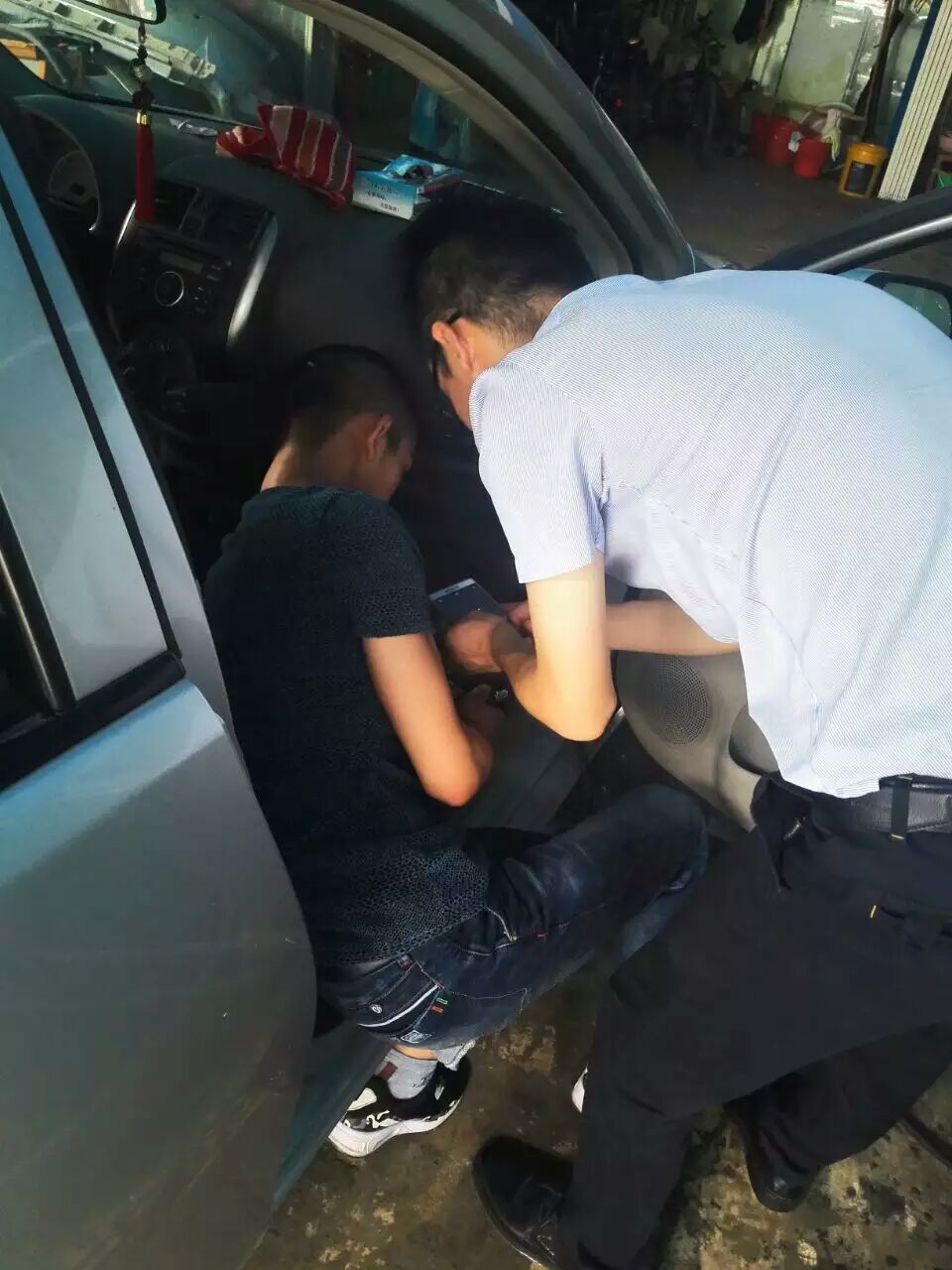 维修师傅尽心尽责的看着维护仪器,车主坐在驾驶位上偷师学艺。