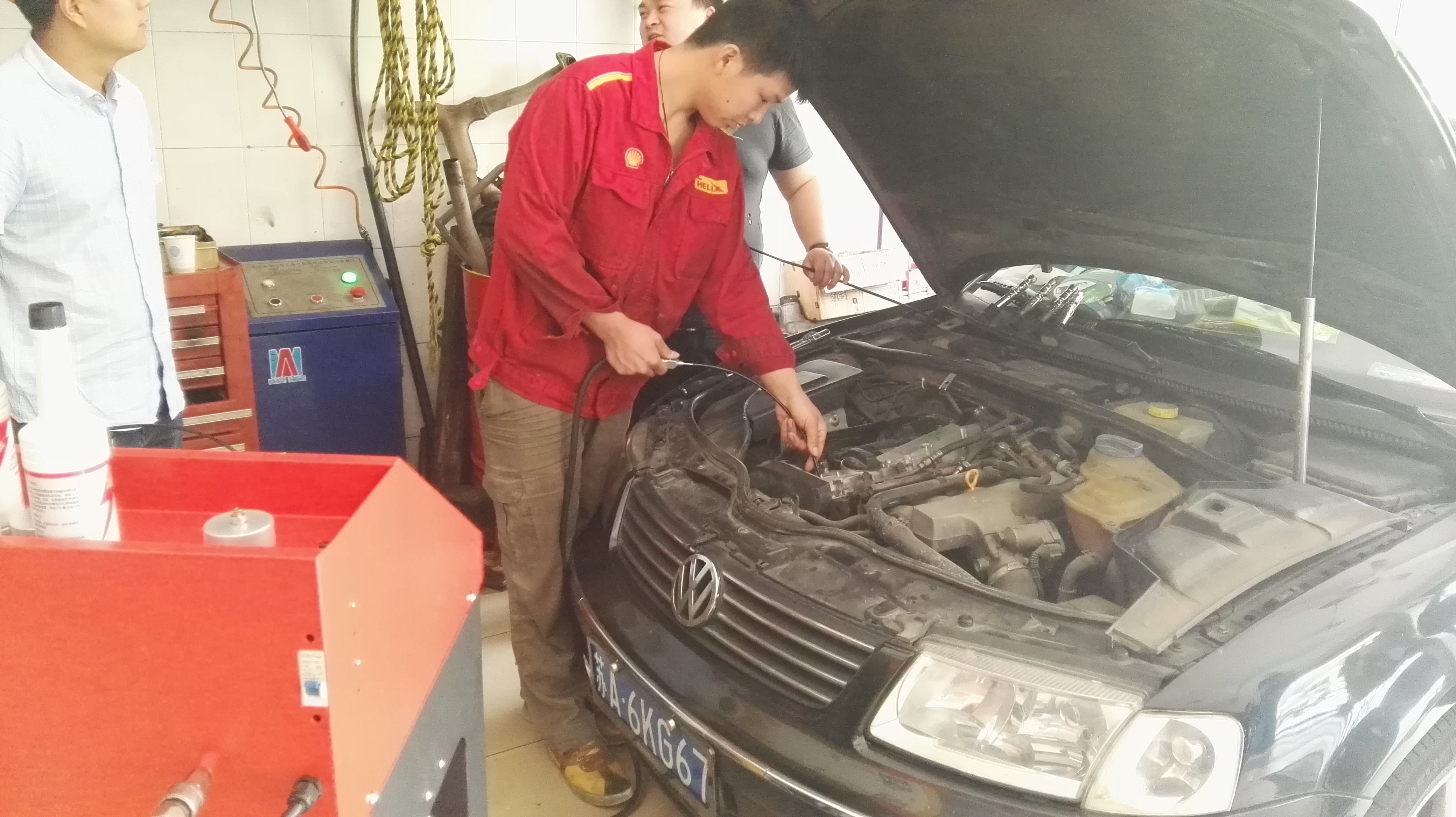 车主用期待的浅笑欣赏着维修师傅在给他的爱车维护。