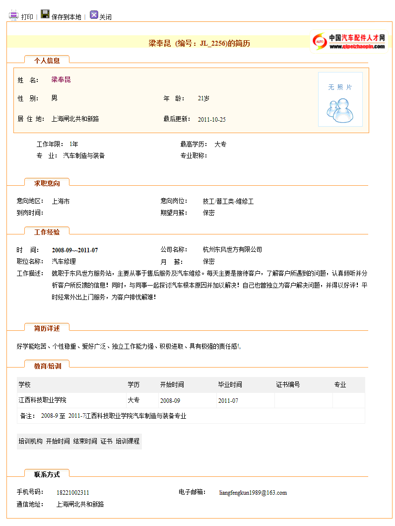 中国汽车配件人才网:梁奉昆(男-21岁)求职上海汽车修理